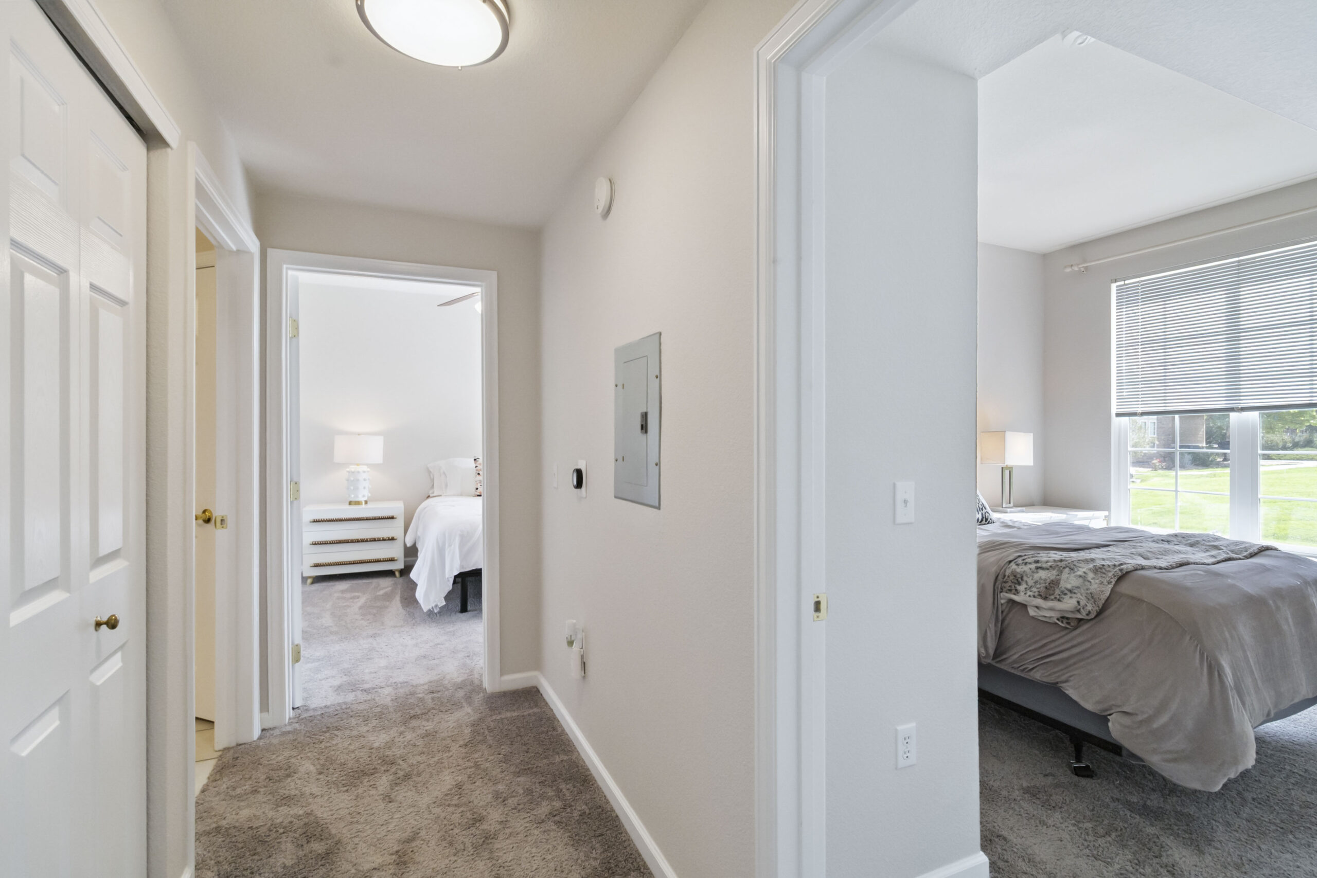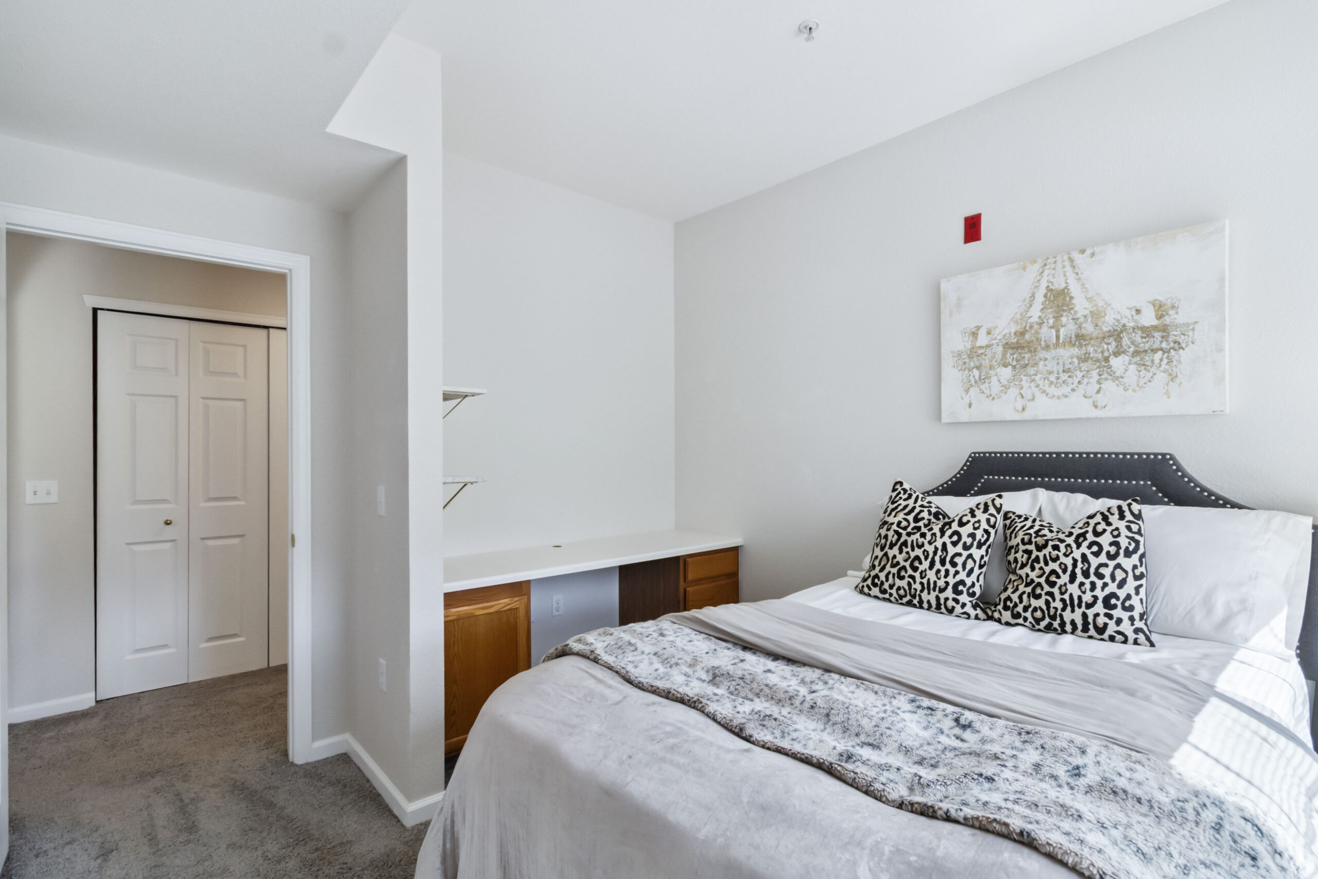 The well-appointed kitchen connects effortlessly to the living space, while the spacious secondary bedroom features a built-in desk—perfect for a home office, guest space, or creative retreat. The dual-access bathroom with double sinks offers both style and convenience, easily accessible from the hallway and the primary suite.